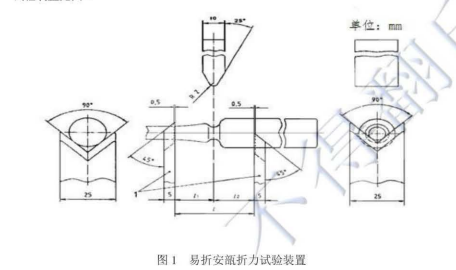 在兩金屬支架之間設定一段距離(如圖上圖1 所示,并按表上面表中相應規定) ,以便在被測安瓿瓶的中心軸成 90度的二個金支架之間施加折斷力,直至安瓿折斷 ,記錄下折斷力值。 注:在試驗點刻痕易折安瓿折斷力時 ,應將裝置中的加力部件定位在刻痕中間(刻痕向下) , 否則折斷力會增大。