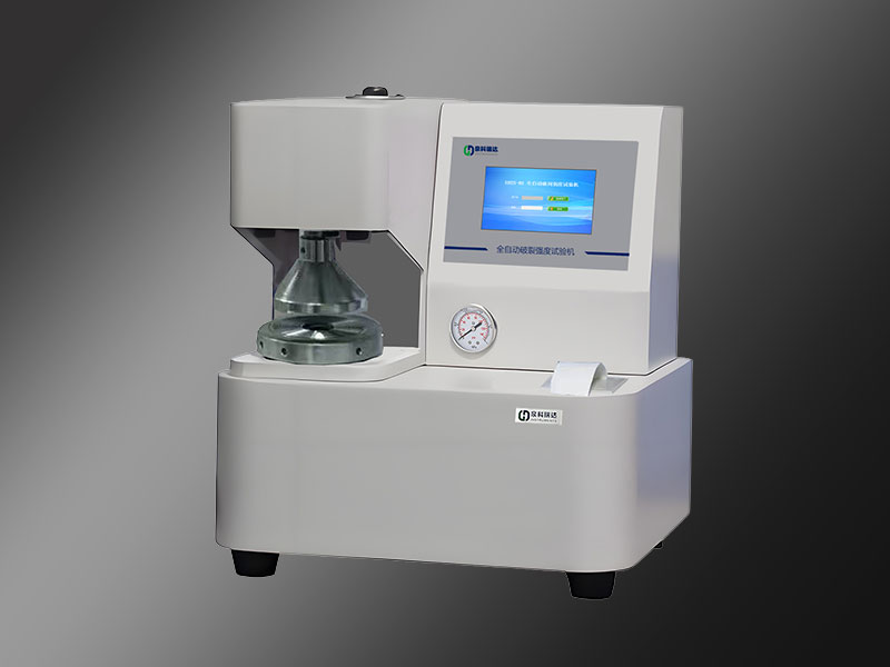 將試樣置于膠膜之上,通過氣動(dòng)方式使上下夾頭將試樣均勻夾持,然后均勻施加載荷,使試樣在膠膜的頂壓作用下凸起,直至試樣破裂,此時(shí)儀器顯示液壓的最大值即為試樣耐破值。