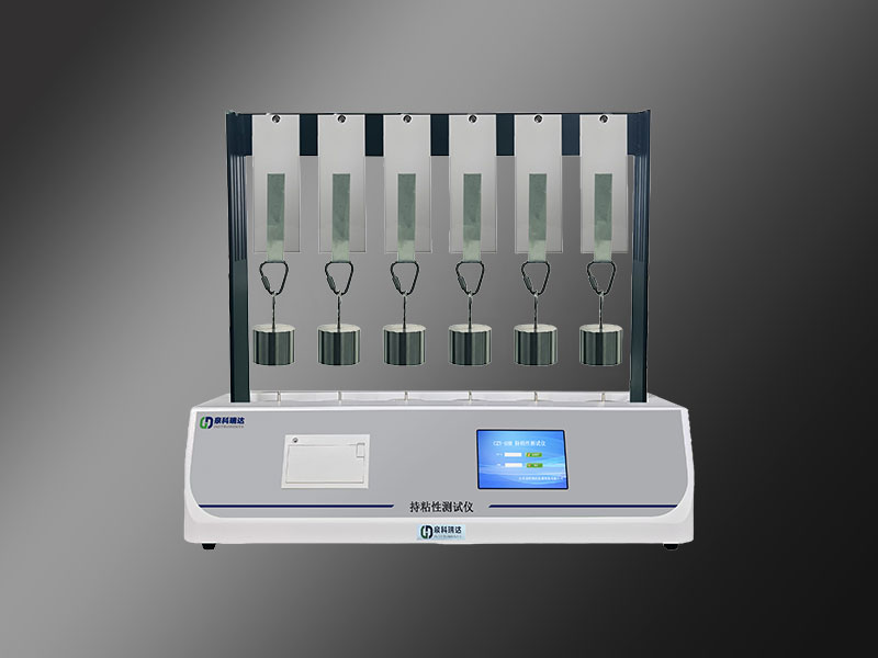 把貼有試樣的試驗板垂直吊掛在試驗架上,下端懸掛規定重量的砝碼,啟動試驗開始計時,試樣在砝碼重力下被拉脫時計錄整個完全脫離的時間來衡量膠粘帶抵抗拉脫的能力;亦可測試經過指定時間后試樣粘脫的位移量進行膠粘制品持粘性評定(人工測量)。
