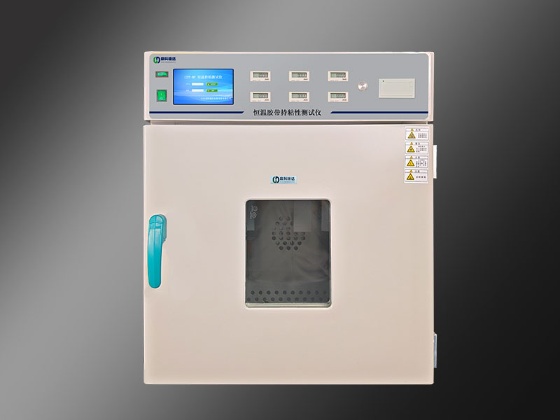 針對膠帶的粘著力做靜態負載試驗,設定在一定溫度下、一定的荷重下自動計時膠帶所能保持的時間,以確認膠帶粘著的時效。