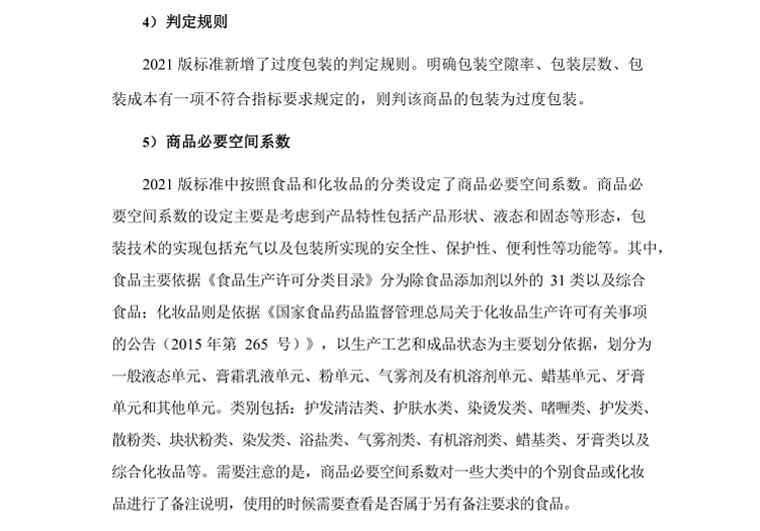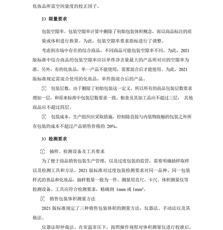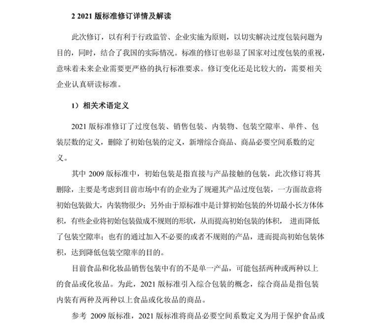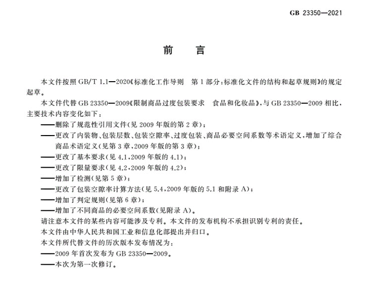 本次食品和化妝品限制商品過(guò)度包裝要求新標(biāo)準(zhǔn)GB23350的主要變化修訂了過(guò)度包裝、銷售包裝、內(nèi)裝物、包裝空隙率、單件、包裝層數(shù)的定義,刪除了初始包裝的定義,新增綜合商品、商品必要空間系數(shù)的定義;新增檢測(cè)、判定規(guī)則、商品必要空間系數(shù)等。
