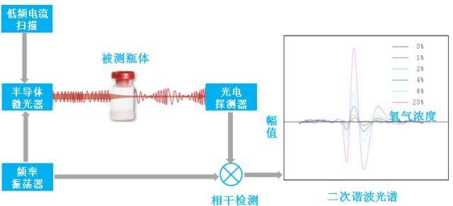 激光檢測法是運用TDLAS(可調諧半導體激光吸收光譜)激光檢測技術檢測無菌制劑容器密封完整性的一種無損、定量方法,該方法獲得了FDA、美國藥典及歐盟藥典推薦,檢測精度優于1μm。氧氣分子對760nm激光具有吸收效應,根據Beer-Lamber(比爾-朗伯)光學吸收定律,被測氣體對激光的吸收量與氣體濃度成正比,通過光學相干技術獲得激光的二次諧波光譜圖,二次諧波光譜圖的幅值變化與容器中氧氣濃度相對應,從而判斷容器的密封完整性。